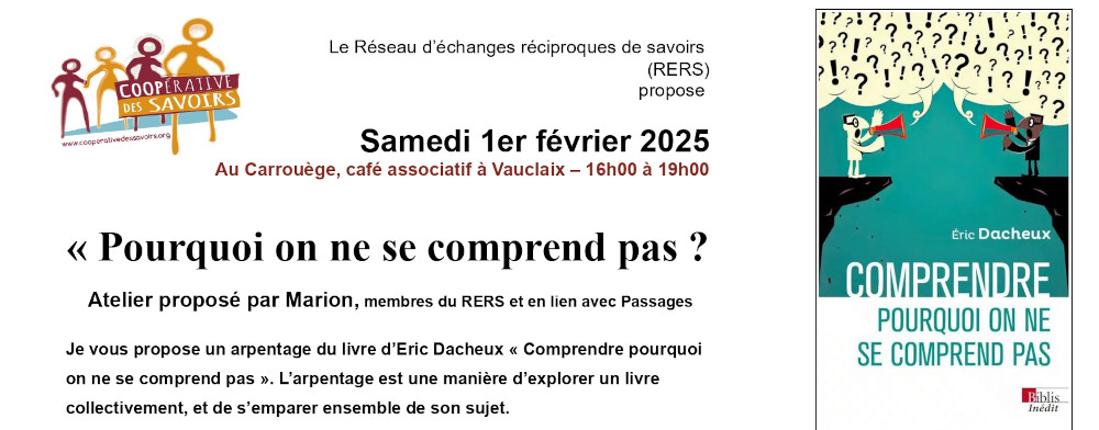 En amour, en amitié, comme dans les sphères administratives, politiques ou professionnelles, la compréhension parfaite et réciproque est rare. Pourquoi l’incompréhension est-elle la norme dominante de nos relations ? » C’est une vraie question, que je me pose souvent ; et surtout, comment faire pour mieux se comprendre ? Vous venez ? On lit et on en parle ? Gratuit et ouvert à tous et toutes sur inscription auprès de la Coopérative des savoirs