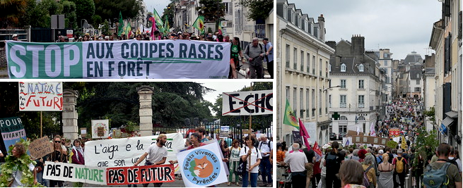 Plus de 1500 représentant·es de collectifs de défense de la forêt ont manifesté à Pau pour exiger que cesse la prolifération d'usines de bois-énergie sur le territoire français, alors que les forêts françaises déjà mises en danger par les activités industrielles (réchauffement climatique, chute de la biodiversité, de la ressource en eau, coupes rases, monocultures...) ne sont pas en capacité de supporter un tel extractivisme.